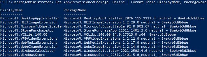 Get-AppxProvisionedPackage -Online | Format-Table DisplayName, PackageName