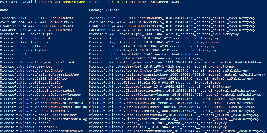 Get-AppxPackage -AllUsers | Format-Table Name, PackageFullName
